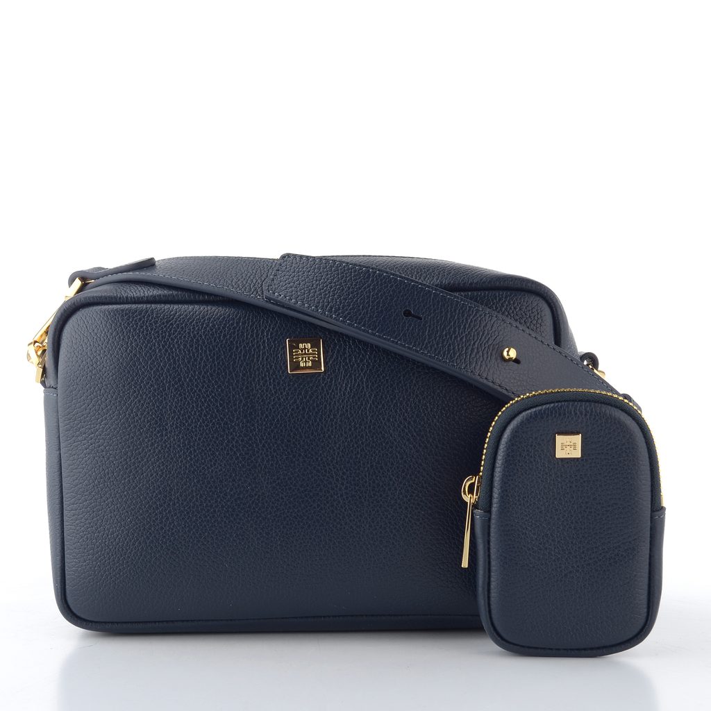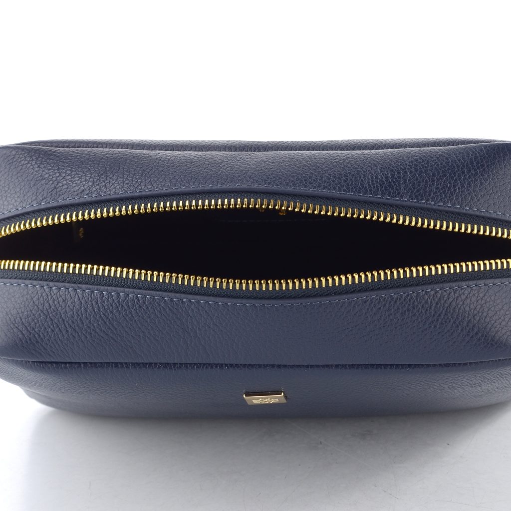 Luxusní malá dámská kabelka ze strukturované kůže v tmavě modré barvě s etují na karabince.