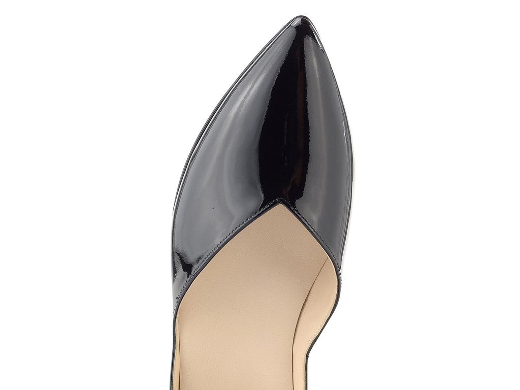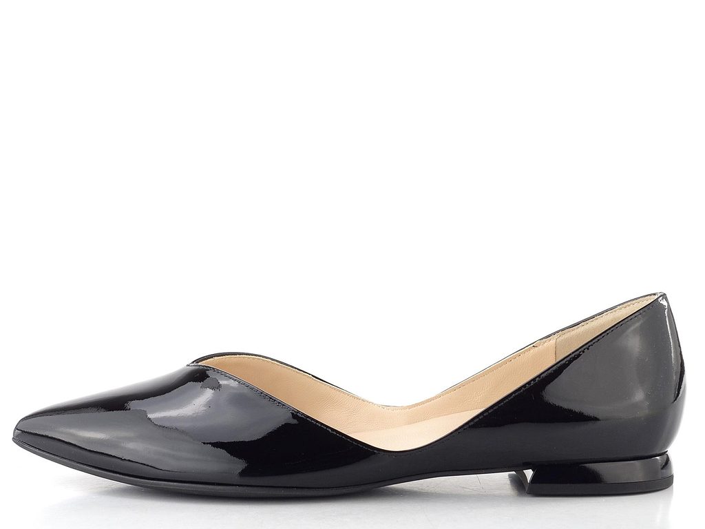 Luxusní dámské špičaté baleríny z lakované kůže v černé barvě na nízkém lakovaném podpatečku.
