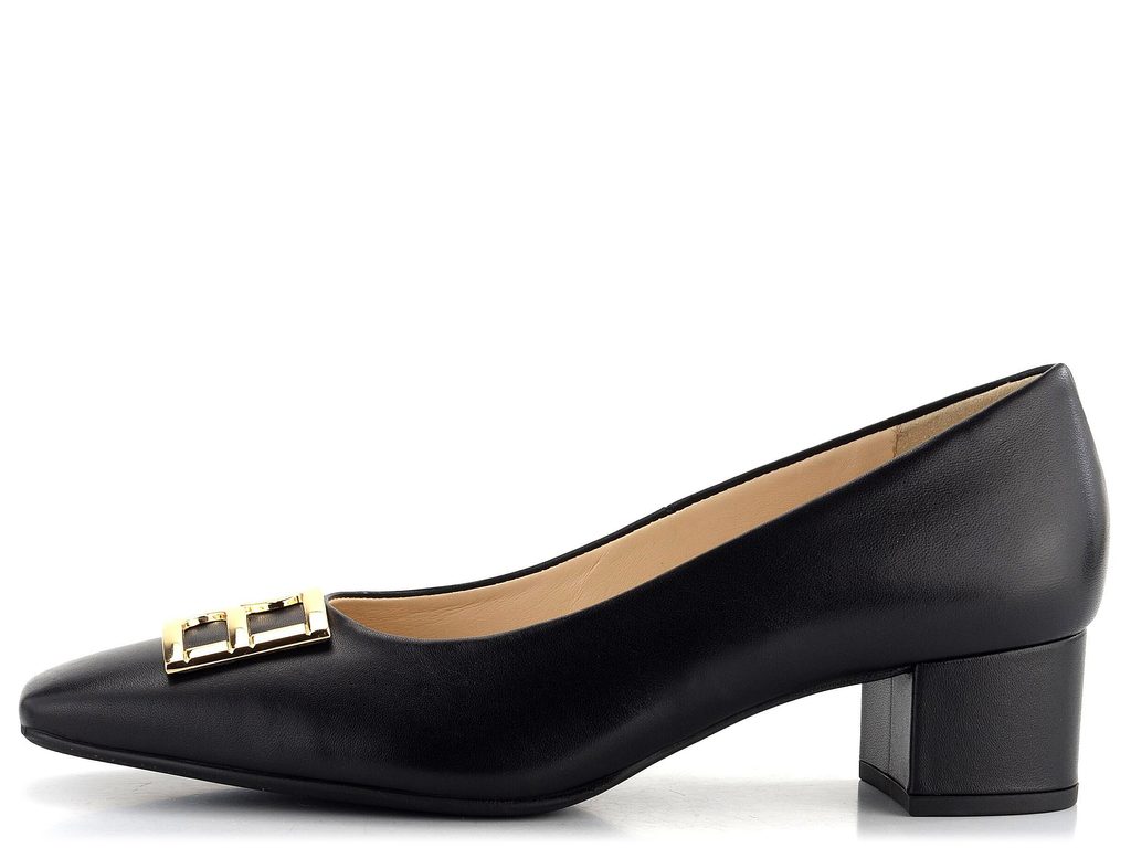 Luxusní dámské černé lodičky s módní karé špičkou, ozdobnou sponou a širokým podpatkem.