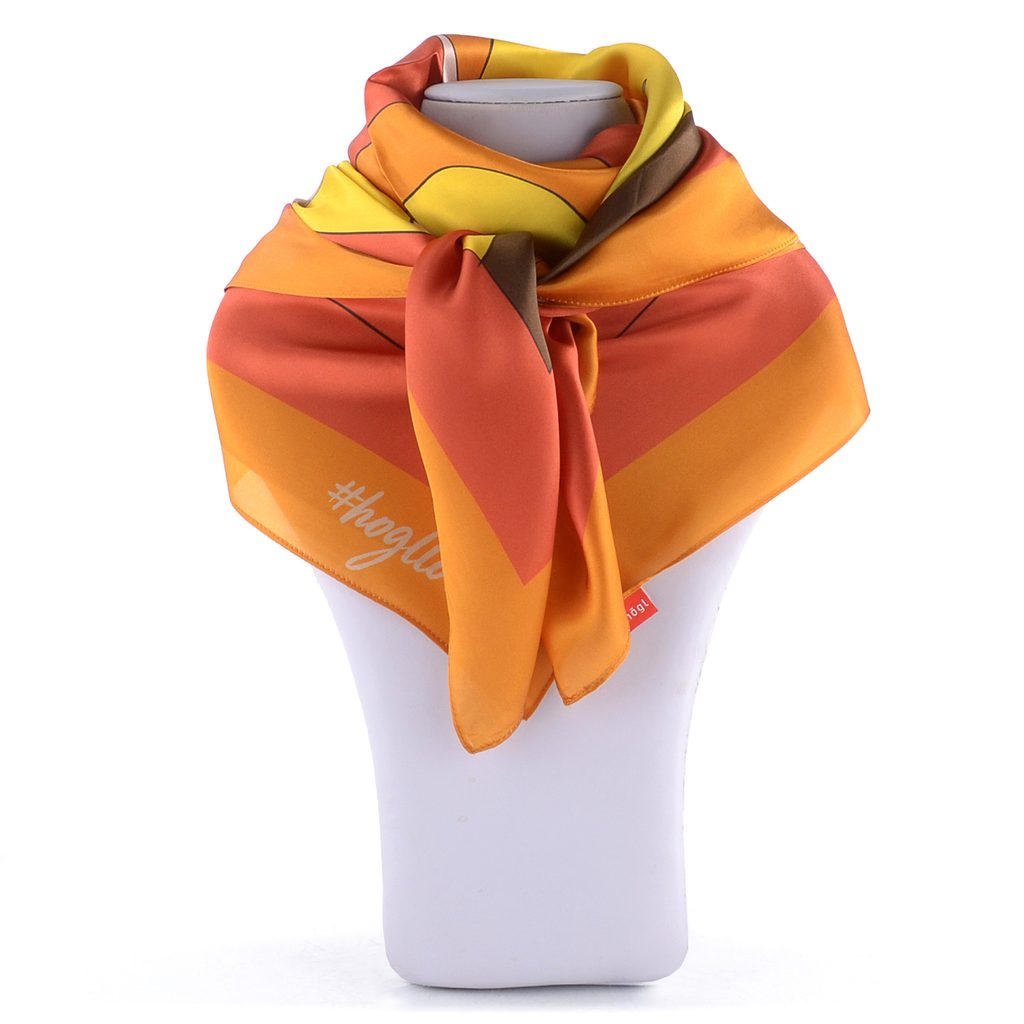 Luxusní hedvábný šátek s motivem srdce v pěkné kombinaci oranžové, červené a žluté barvy.