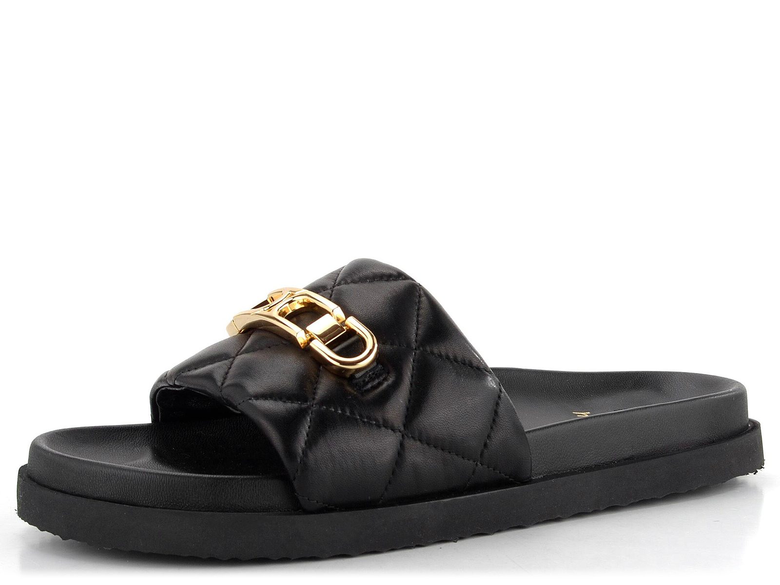 Dámské módní, anatomicky tvarované a velmi pohodlné pantofle v černé barvě s kovovou ozdobou.