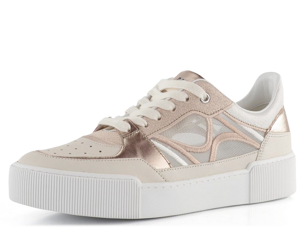 Luxusní šněrovací tenisky z kombinace vzdušné síťoviny a hladké kůže s metalickými doplňky.