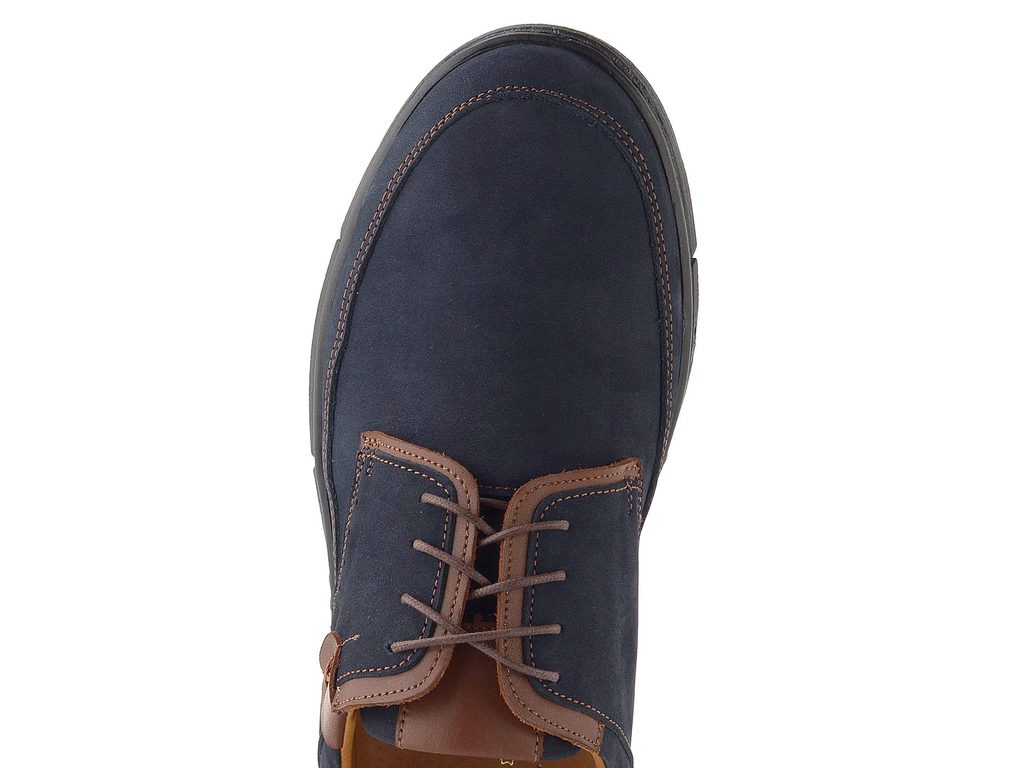 Pánské vycházkové nubukové polobotky na šněrování, v tmavě modré barvě s hnědými doplňky a koženou vyjímatelnou vložkou.