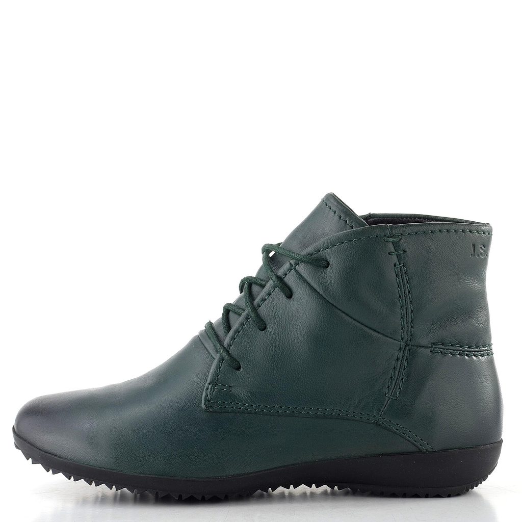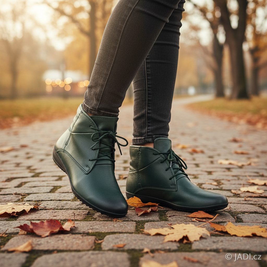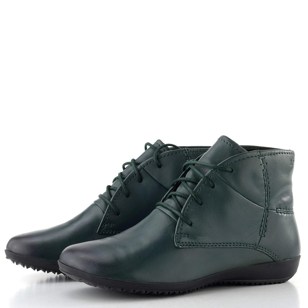 Vyteplený dámský šněrovací kotník z jemné kůže v nevšedním odstínu tmavě zelené barvy.