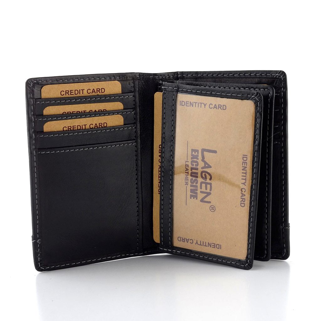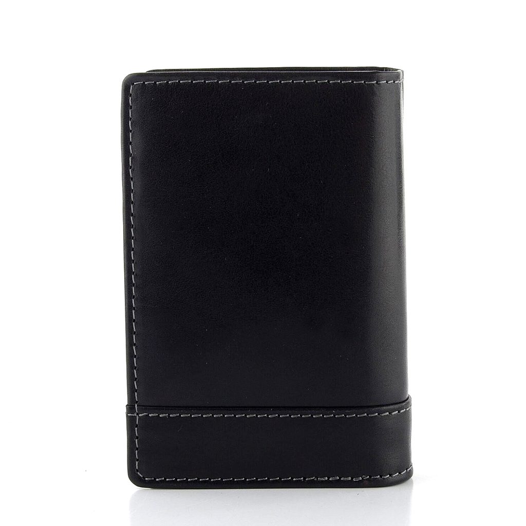 Dokladové pouzdro vyrobené z hladké kůže v černé barvě, uvnitř je bohatě vybavené přihrádkami na karty i osobní doklady.