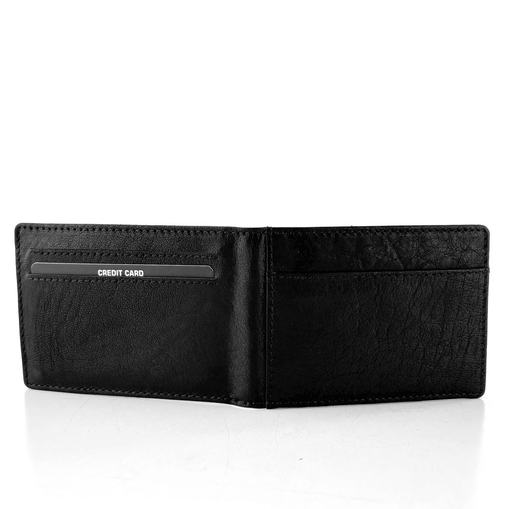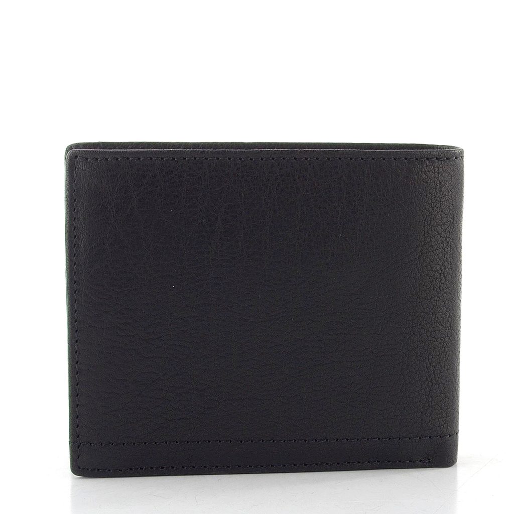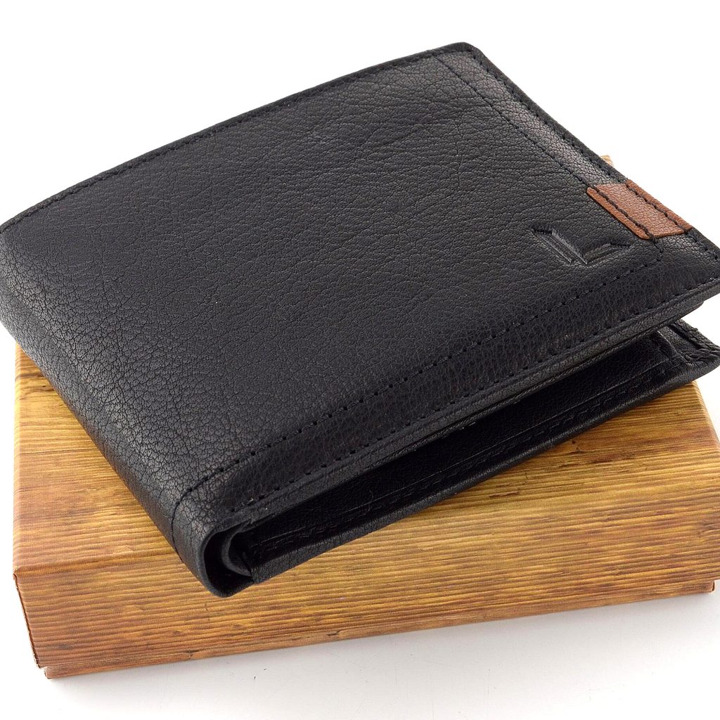 Jednoduchá pánská kožená peněženka v černé barvě s decentním hnědým doplňkem.