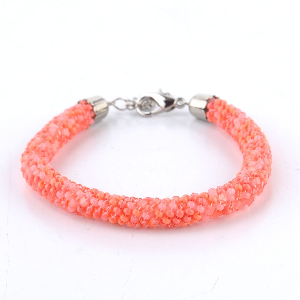 Náramek ve tvaru dutinky z drobných rokajlů v lososově růžové barvě.