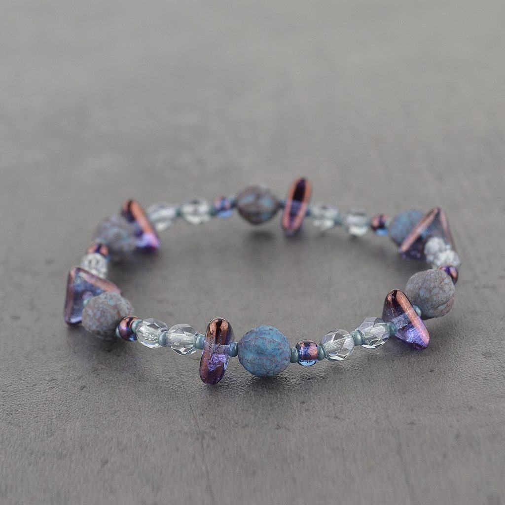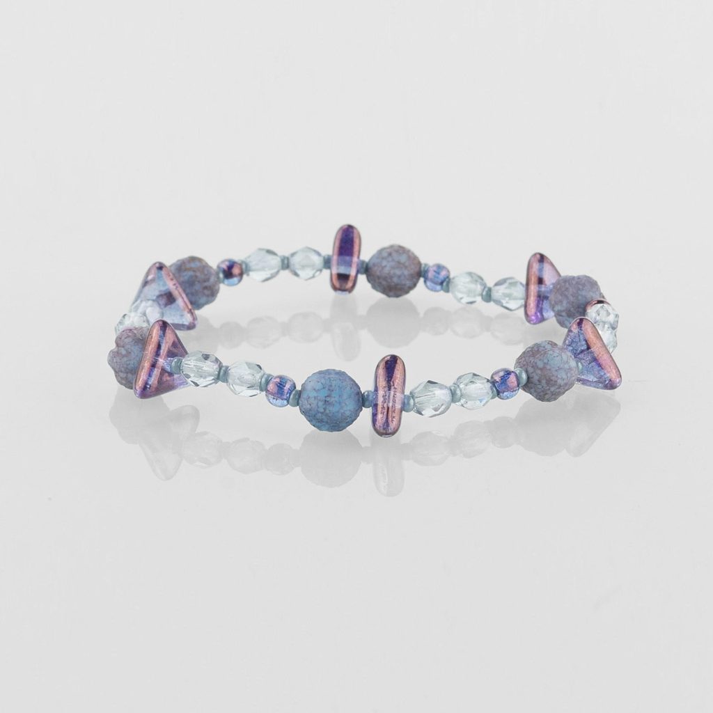 Dámský náramek ze skleněných kamenů ve fialovo-modrém provedení.