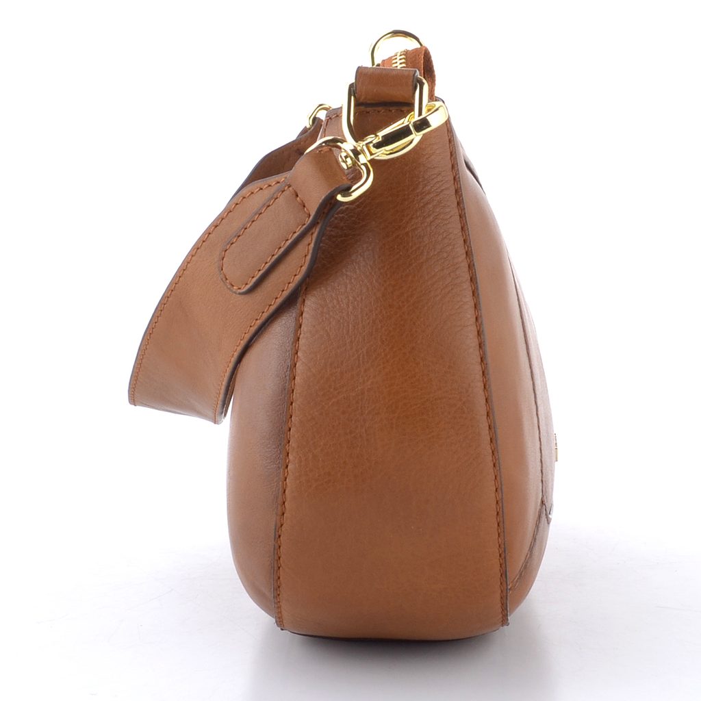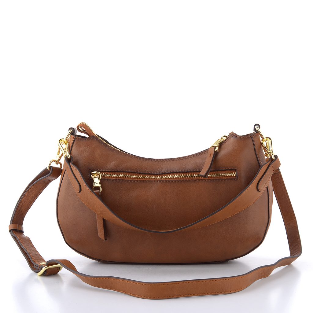 Originální dámská kabelka v přírodní hnědé barvě a oválném střihu, s dvěma vyměnitelnými popruhy.