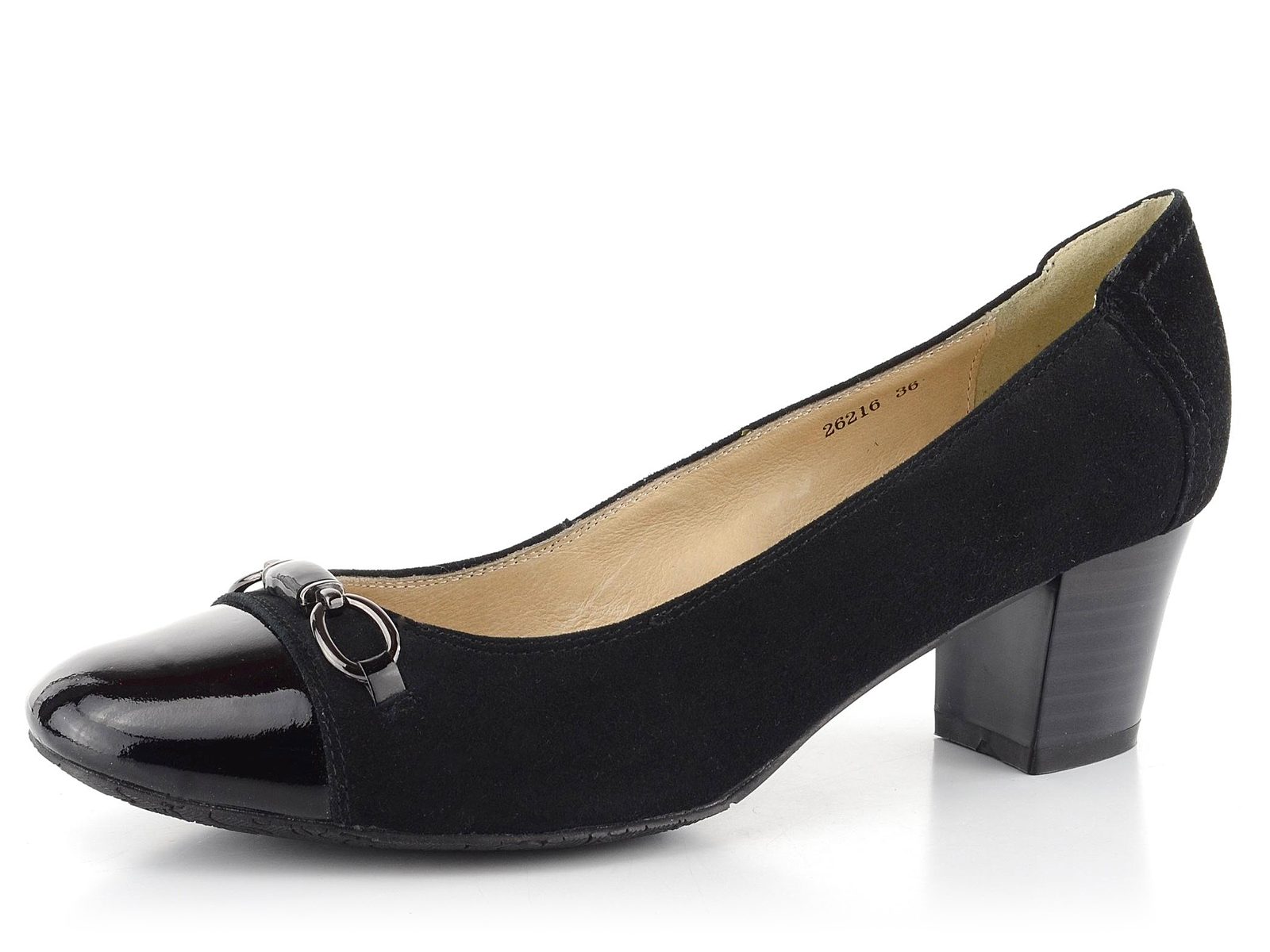 Osobité lodičky renomované značky Deska budou zcela jistě noblesním a elegantním doplňkem vašeho outfitu. Lodičky, které můžete obout jak ke kalhotám, k sukni nebo kostýmku jsou vyrobeny z kombinace broušené usně a usně lakované - obojí v černé barvě. Decentní kovové zdobení umocňuje eleganci modelu. Vnitřní podšívka lodiček je celokožená, nášlapná stélka je lehce vyměkčena pro příjemnější nošení. Flexibilní podešev přechází ve stabilní podpatek s jemným dezénem.