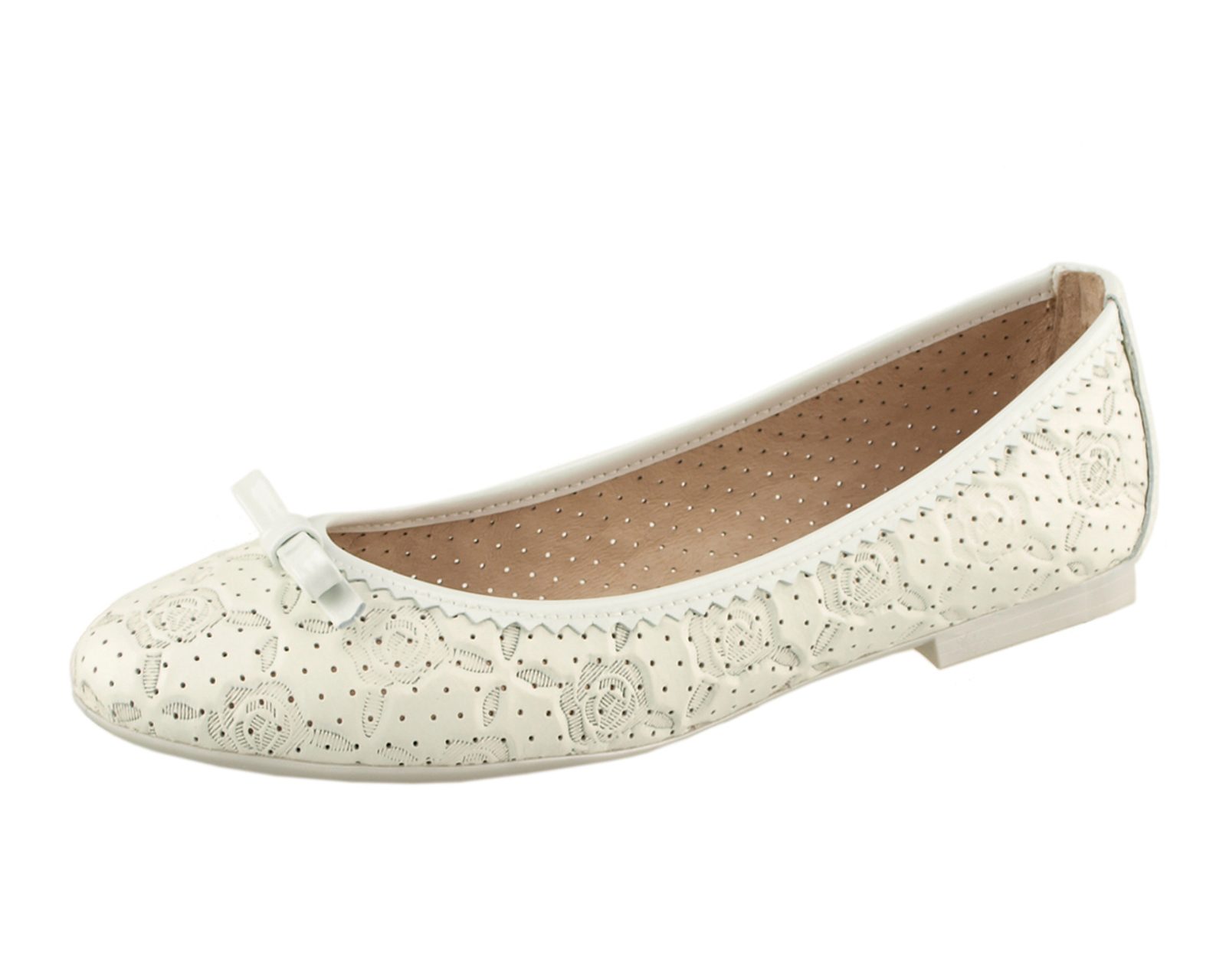 Vyjímečné balerínky v čisté linii a decentní eleganci pochází z dílny španělských tvůrců značky Hispanitas. Originálně vytlačovaná useň je v odraženém bílém odstínu (nádech šedé), doplněna lakovanou mašličkou, obvodovým lemem a patou. Vnitřek balerín je celokožený, opatek je zabroušený a nášlapná stélka má příjemné vyměkčení pro pohodlnější došlap. Latexová podešev přechází v monoliticky spojený podpateček.