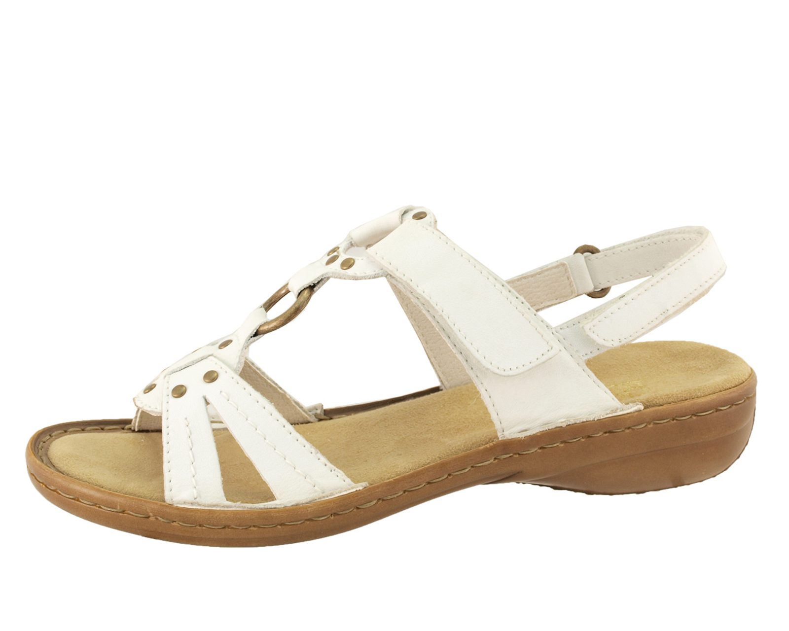 Vzdušné kožené sandálky Rieker jsou v křídově bílé barvě, prstový a nártový pásek je propojen kovovým kroužkem ve starobronzové barvě. Zapínání na nártu je na suchý zip a je délkově upravovatelné. Rovněž tak i patní pásek. Nášlapná stélka je vyměkčená a je potažená příjemnou vlasovou textilií, která dobře odvádí pot.Obuv je šitá a lepená na flexibilní podešev vysokou cca 1,5 cm. pod patou cca 3,5 cm.