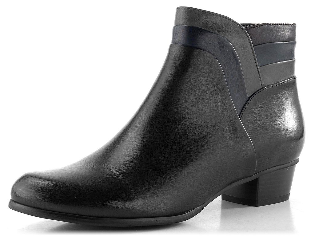 Dámská kotníčková obuv s módně překládanými, různobarevnými dílci z jemné hladké kůže, s postranním zipem a pohodlným nízkým podpatkem.