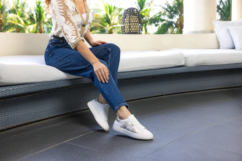 Dámské bílé tenisky na rovné odlehčené platformě s metalickým potiskem a vyjímatelnou vložkou.