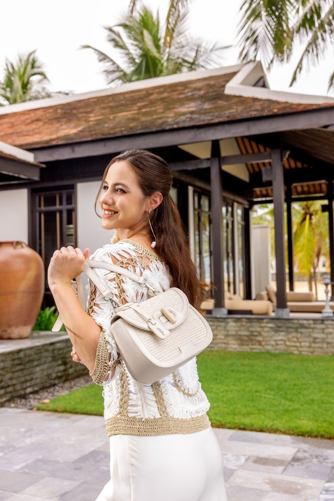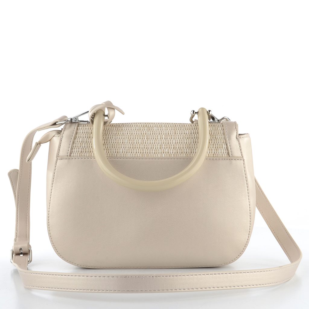 - kabelka vyrobena z pevné hladké syntetiky (drží tvar), přední stranu a klopu tvoří splétané umělé lýko