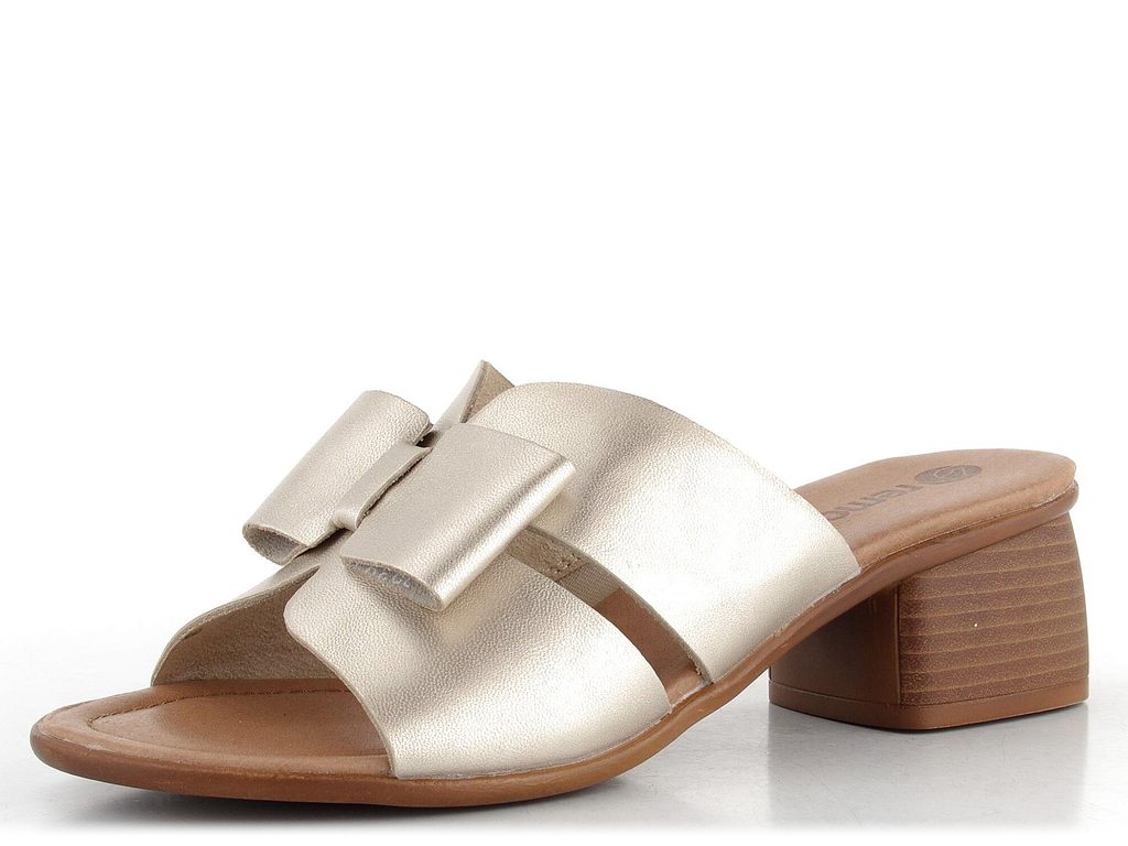 Dámské elegantní pantofle ve světlé metalické barvě, se širokým pohodlným podpatkem.