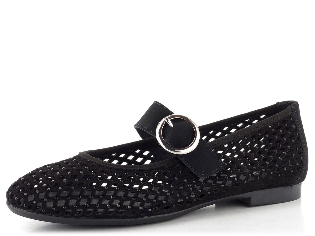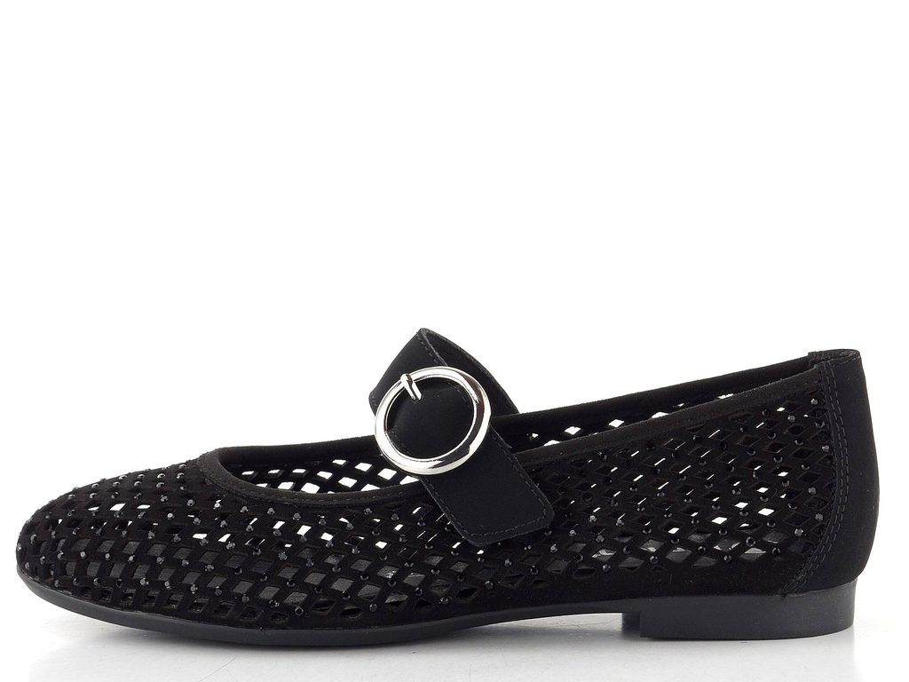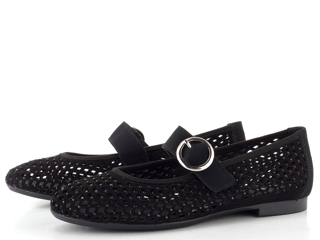 Dámské letní baleríny v černé barvě se vzdušným prořezáváním, třpytivými kamínky a upínacím páskem na suchý zip.