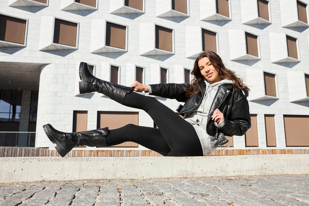 - obuv z hladké syntetiky, která v oblasti lýtka pruží