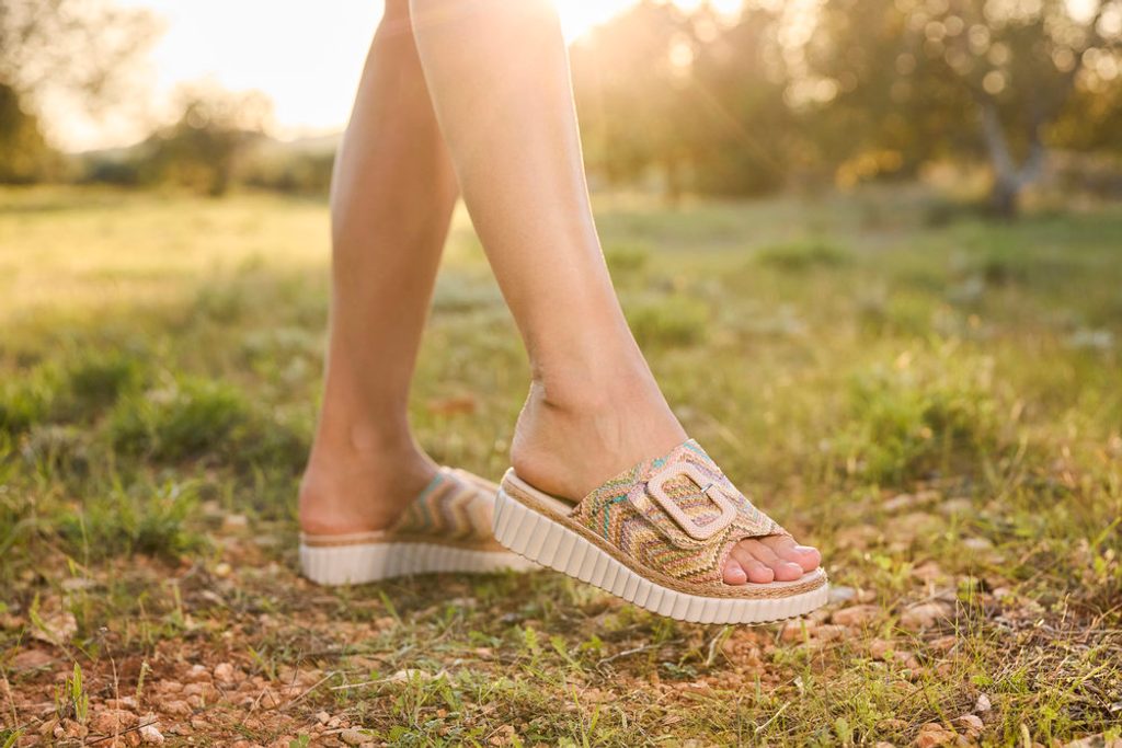 Dámské pantofle z barevného splétaného lýka, se širokým nártovým páskem a vyšší platformou s klínkem.