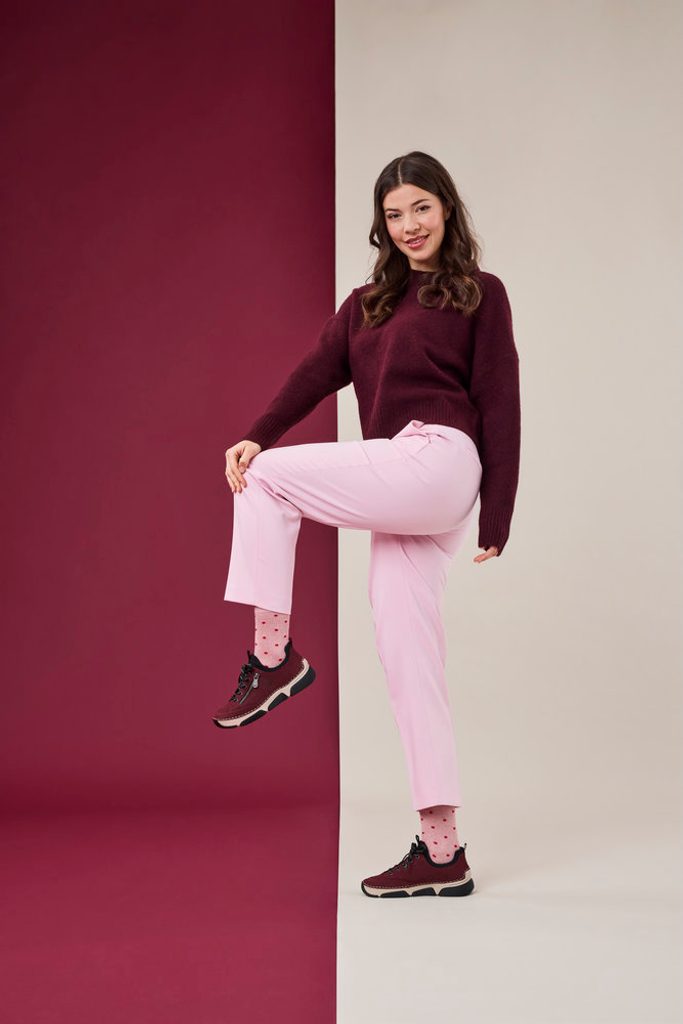 Dámské vínové prozouvací polobotky v ležérním střihu se šněrováním a pružným kotníkovým lemem.