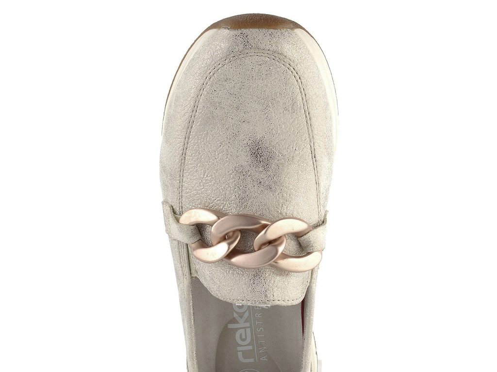 Dámské mokasíny v trendovém metalickém provedení a se sportovním šmrncem od značky Rieker.