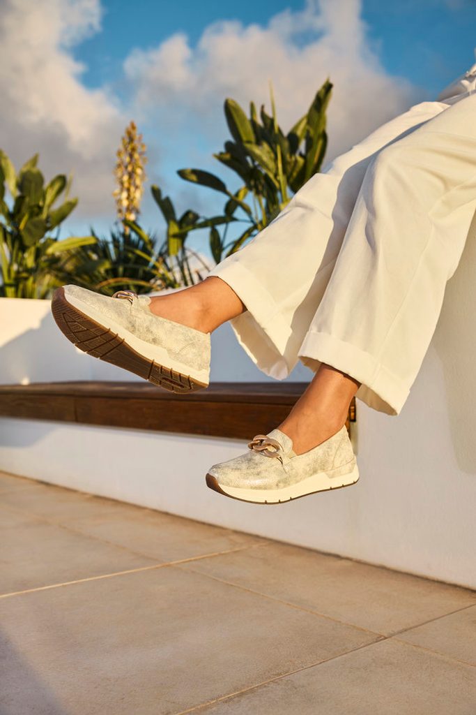 Dámské metalické mokasíny ve sportovním stylu s měkkou vyjímatelnou stélkou uvnitř.