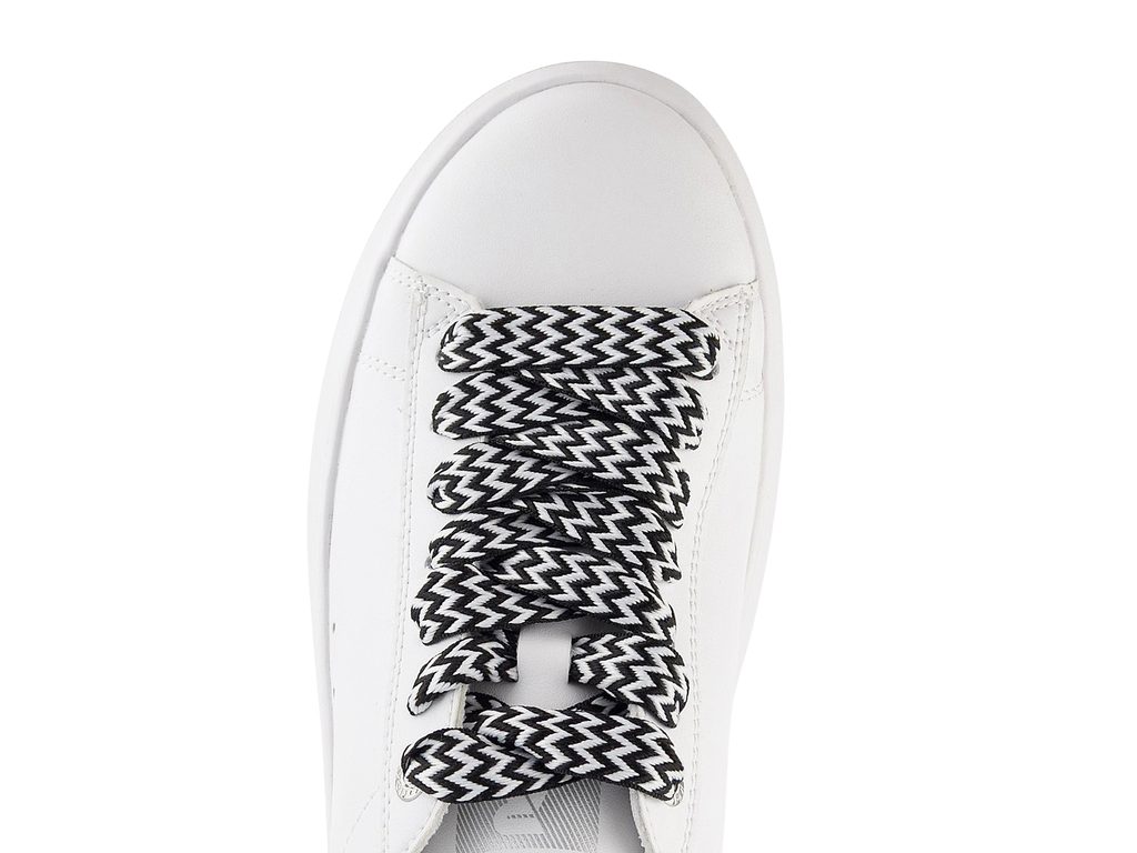 - klasické šněrování s plochými tkaničkami s černo-bílým vzorem