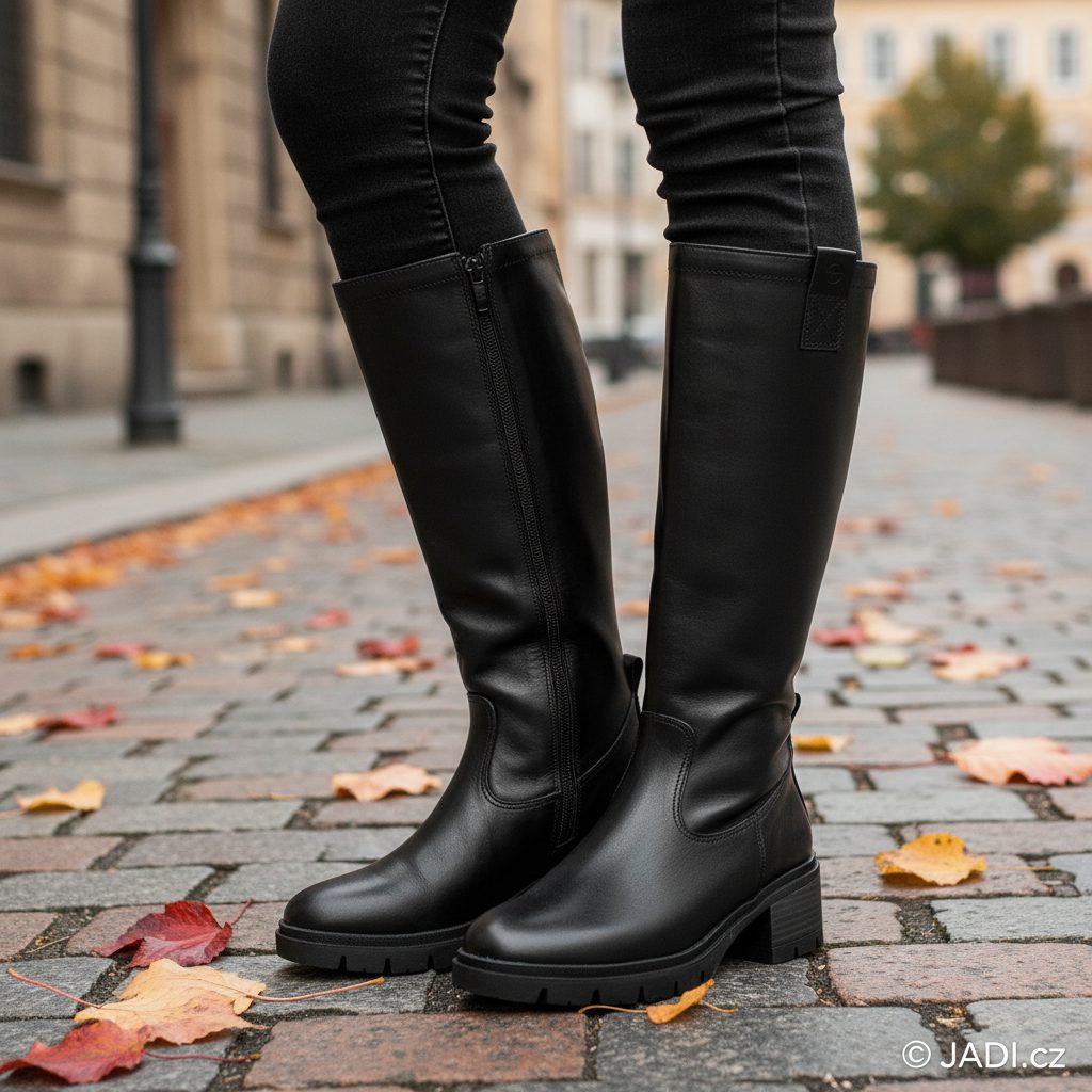 Dámské kožené kozačky na nižším pohodlném podpatku, vyrobené z hladké černé kůže a vybavené teplou podšívkou.