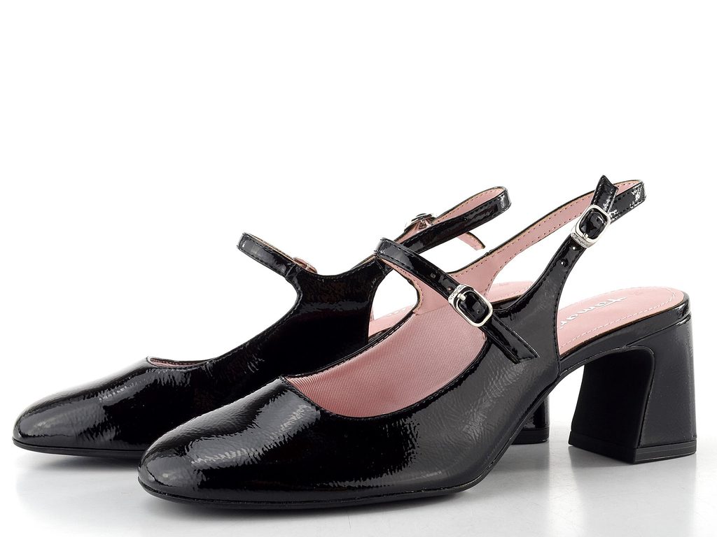 Elegantní dámské lodičky v černém lakovaném provedení s nártovým páskem, volnou patou a stabilním podpatkem.