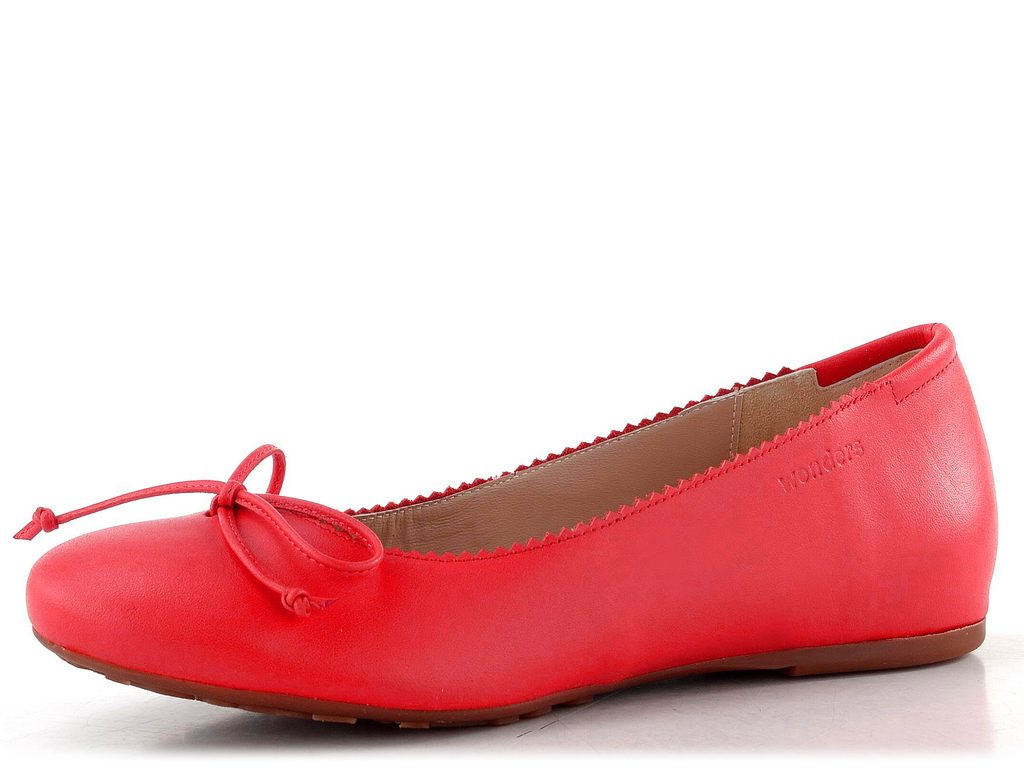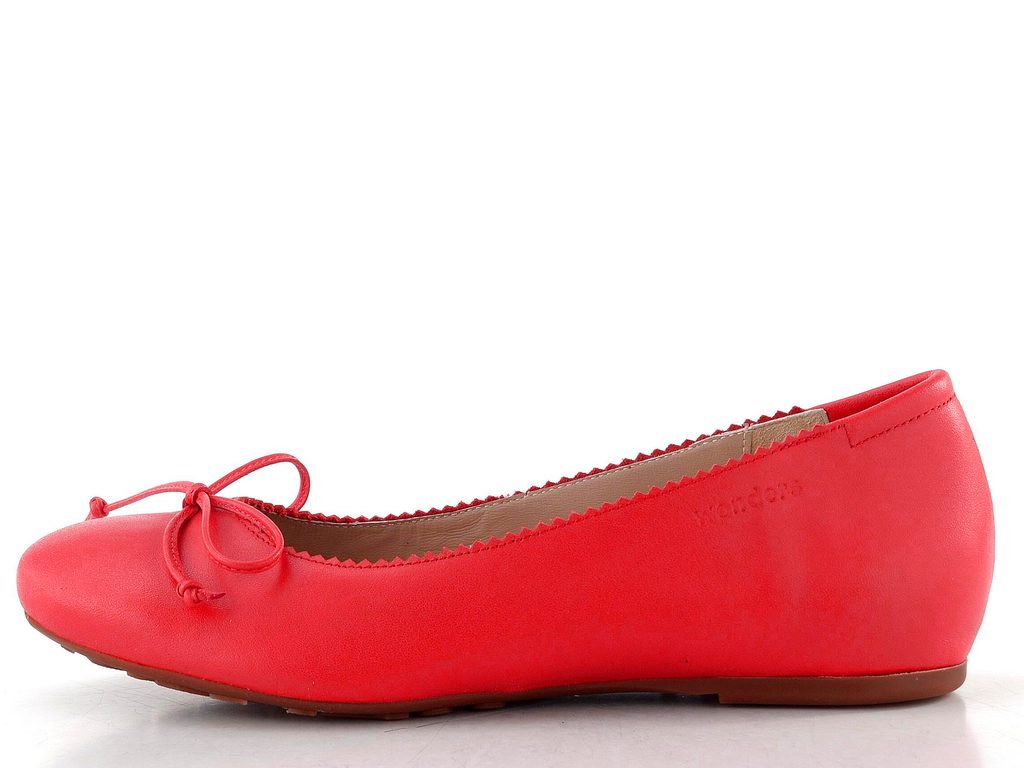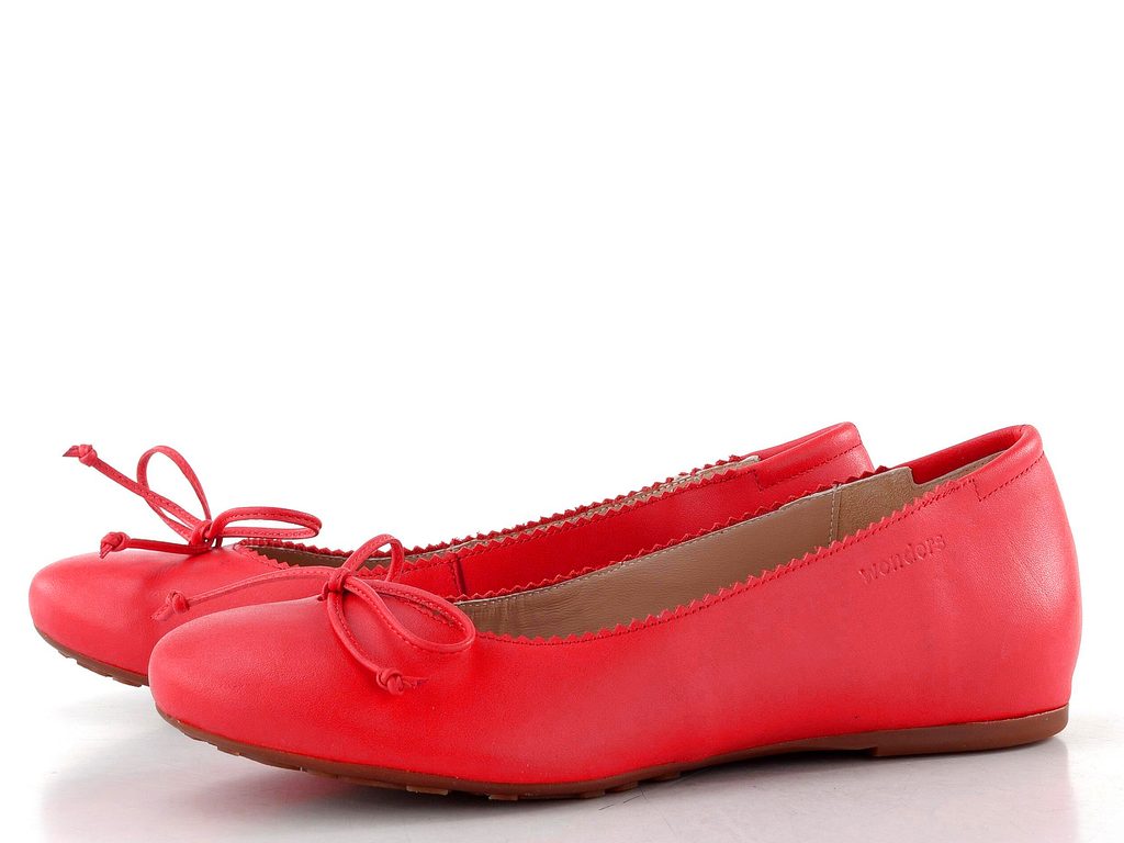 Pohodlné dámské baleríny z poddajné kůže v jasně červené barvě s decentní mašličkou a vnitřním klínkem.