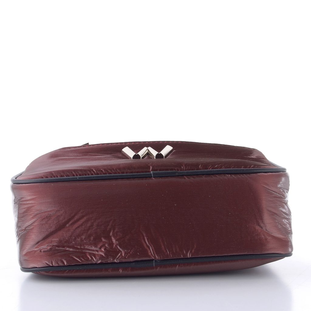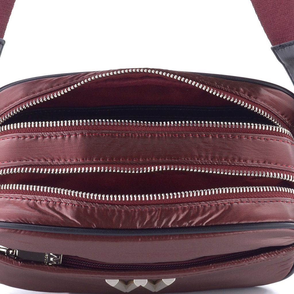 Dámská textilní crossbody kabelka ve vínově červené barvě s dvojitou hlavní kapsou.