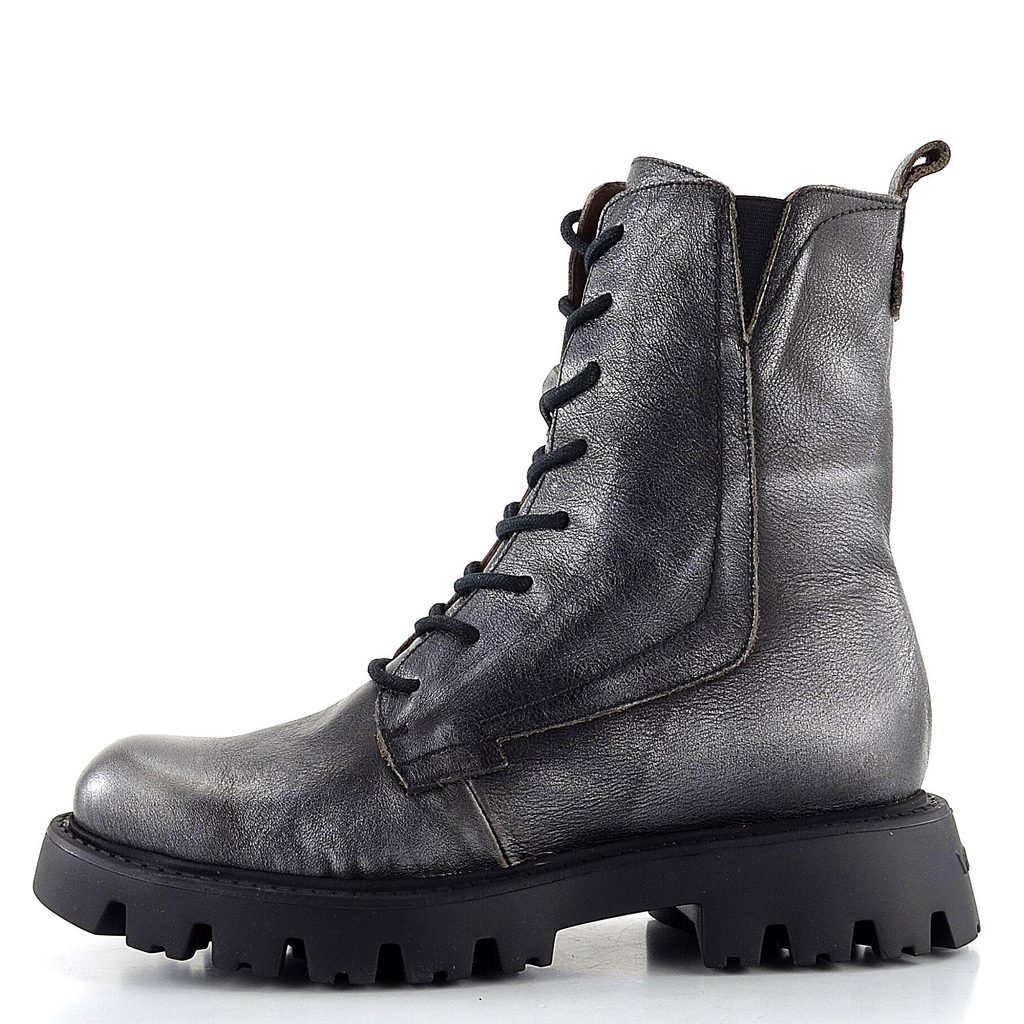 Šněrovací dámský kotník z metalické kůže v kovově šedé barvě na odlehčené podešvi s hrubým vzorkem.